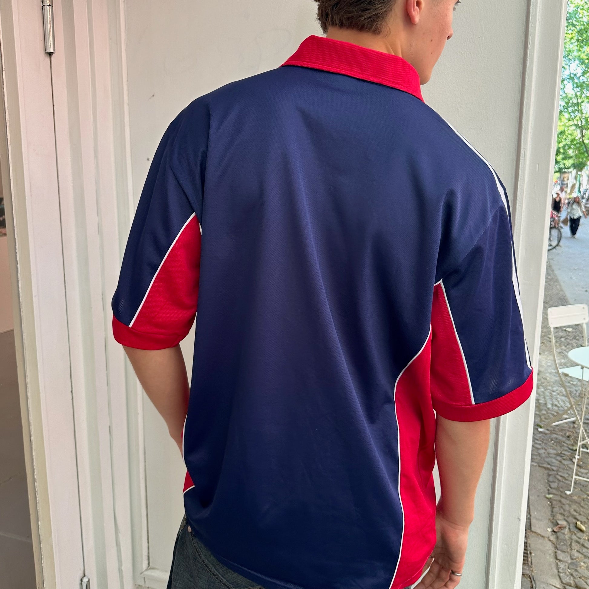 Leo is wearing a blue and red Adidas jersey. Men's size L.