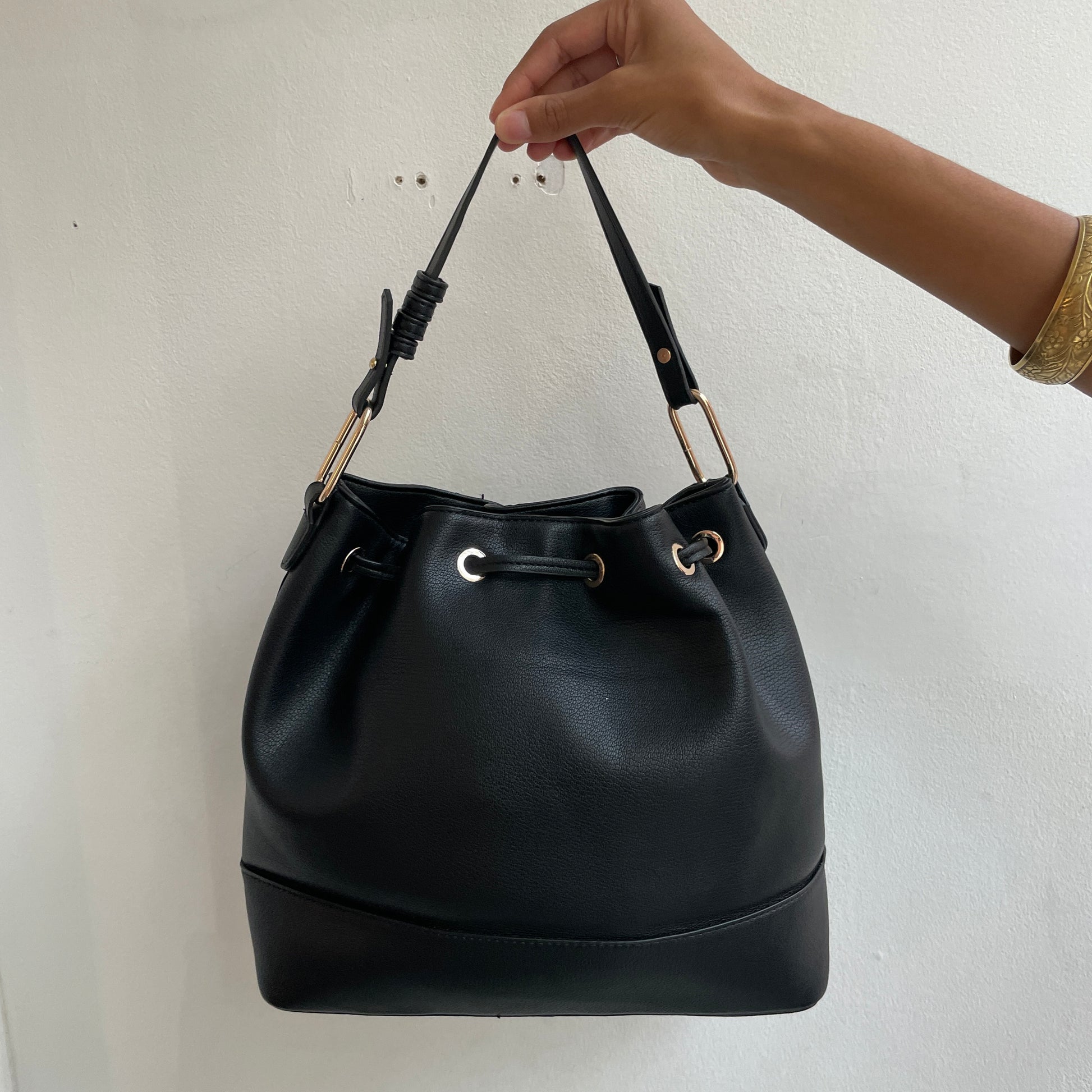 Schwarze Handtasche mit Animalprint Muster und goldenen Details.