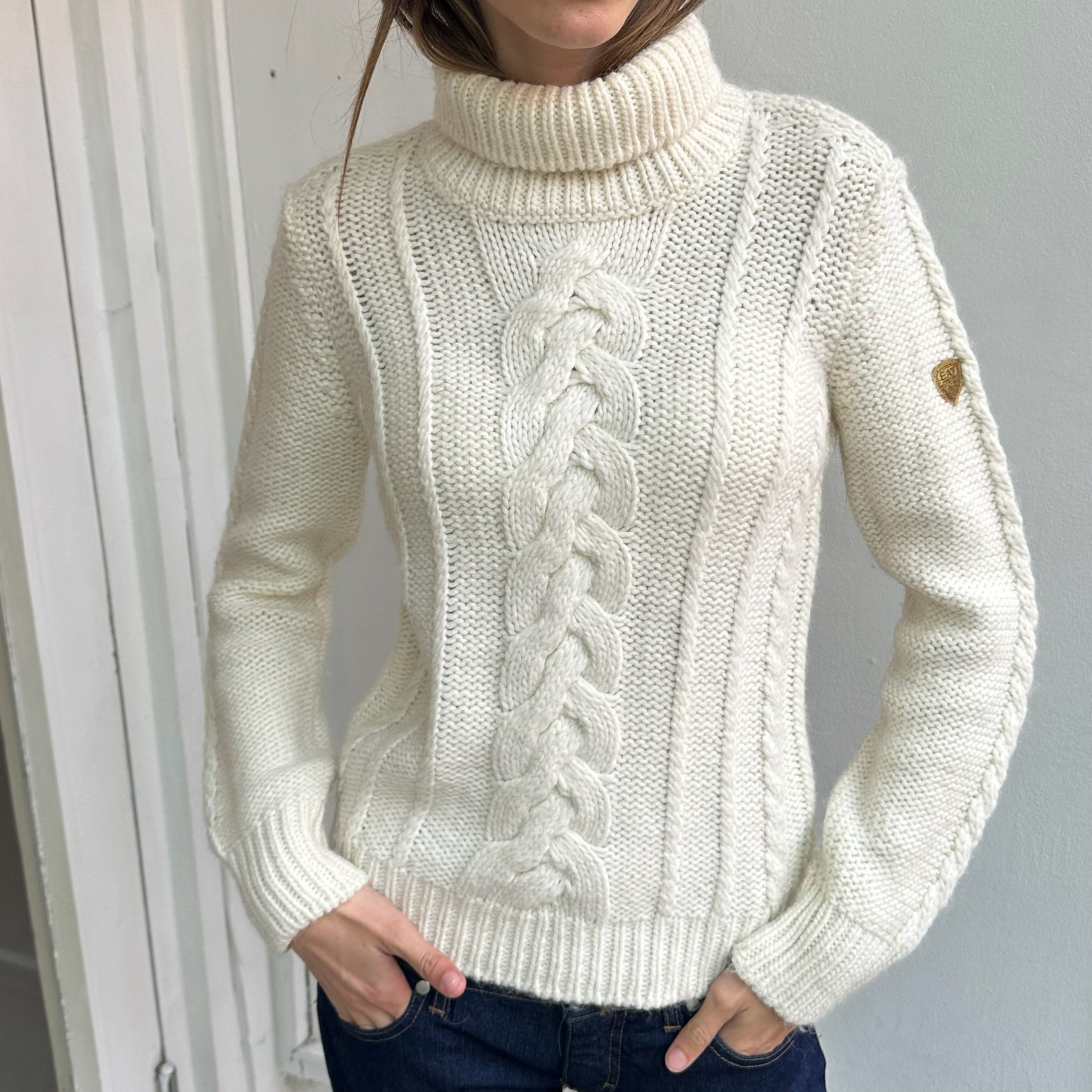 Weißer Strickpullover mit Rollkragen von der Marke Armani in Größe S.