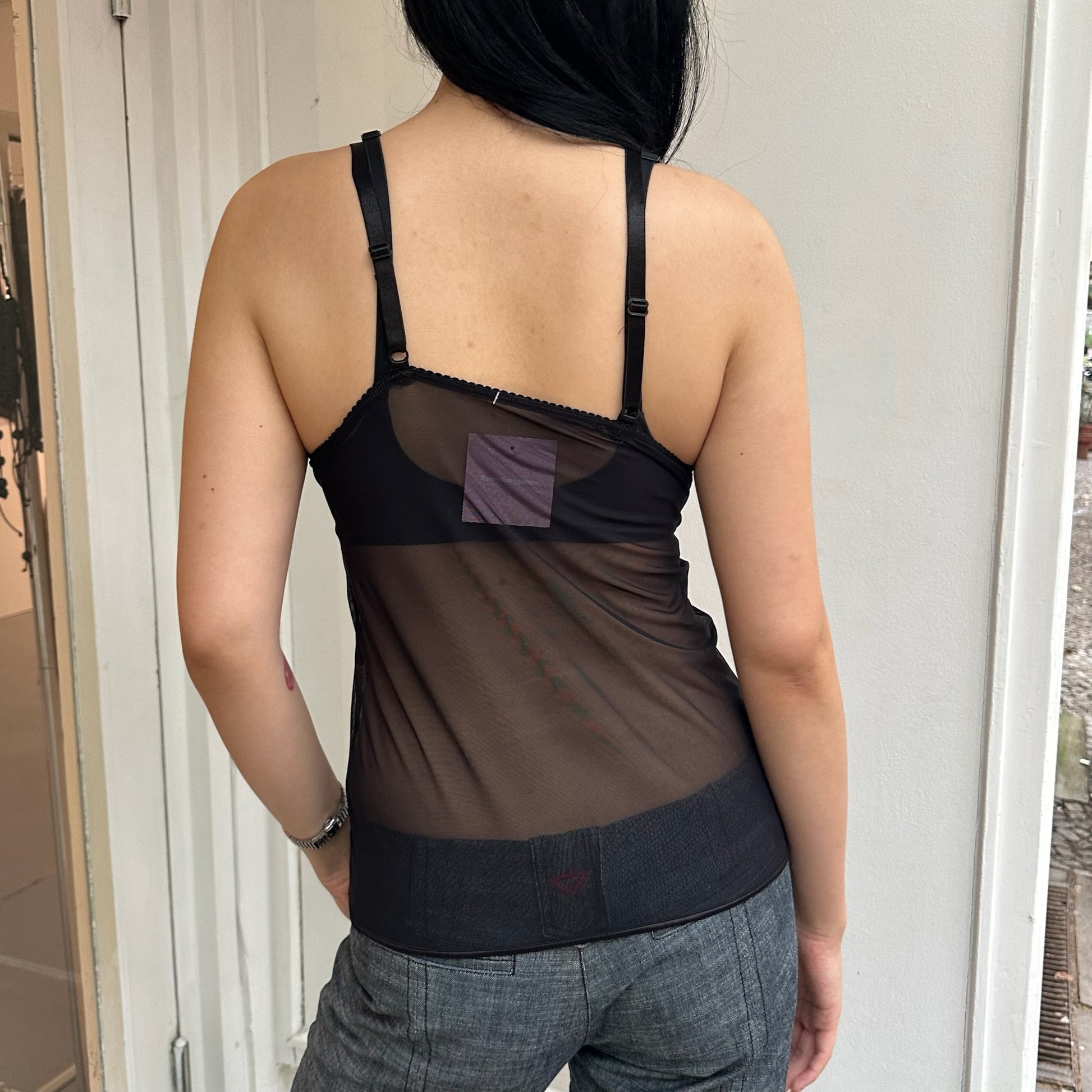 Nhi trägt ein schwarzes Cami-Top mit Korsettschnürung im Brustbereich und Mesh-Einsätzen. Größe S.