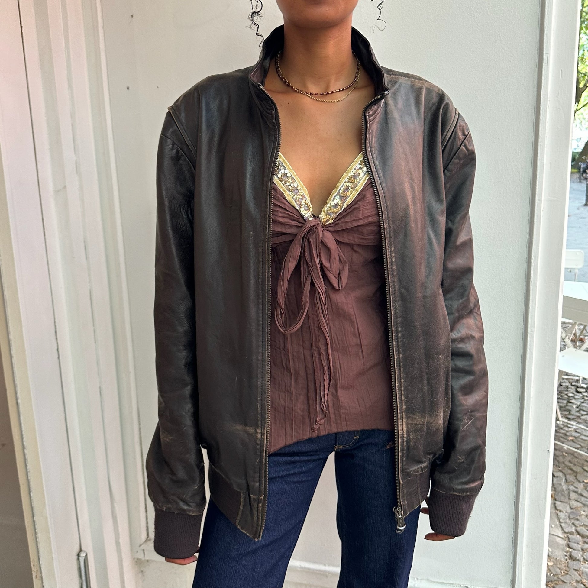 Dunkelbraune Lederjacke mit leichten Abnutzungen. Größe: M