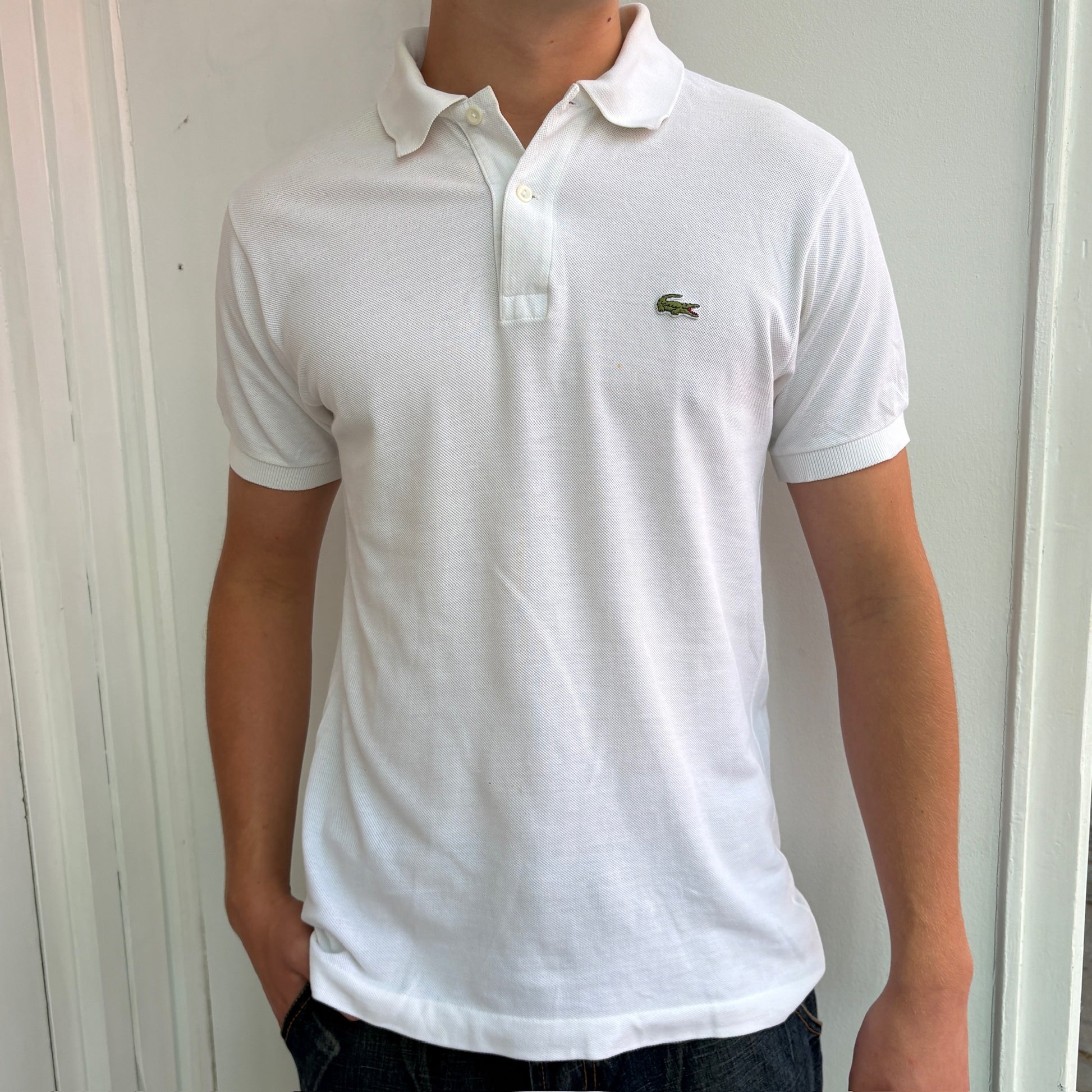 Leo is wearing a cream-colored Lacoste polo shirt. Men's size S/M.