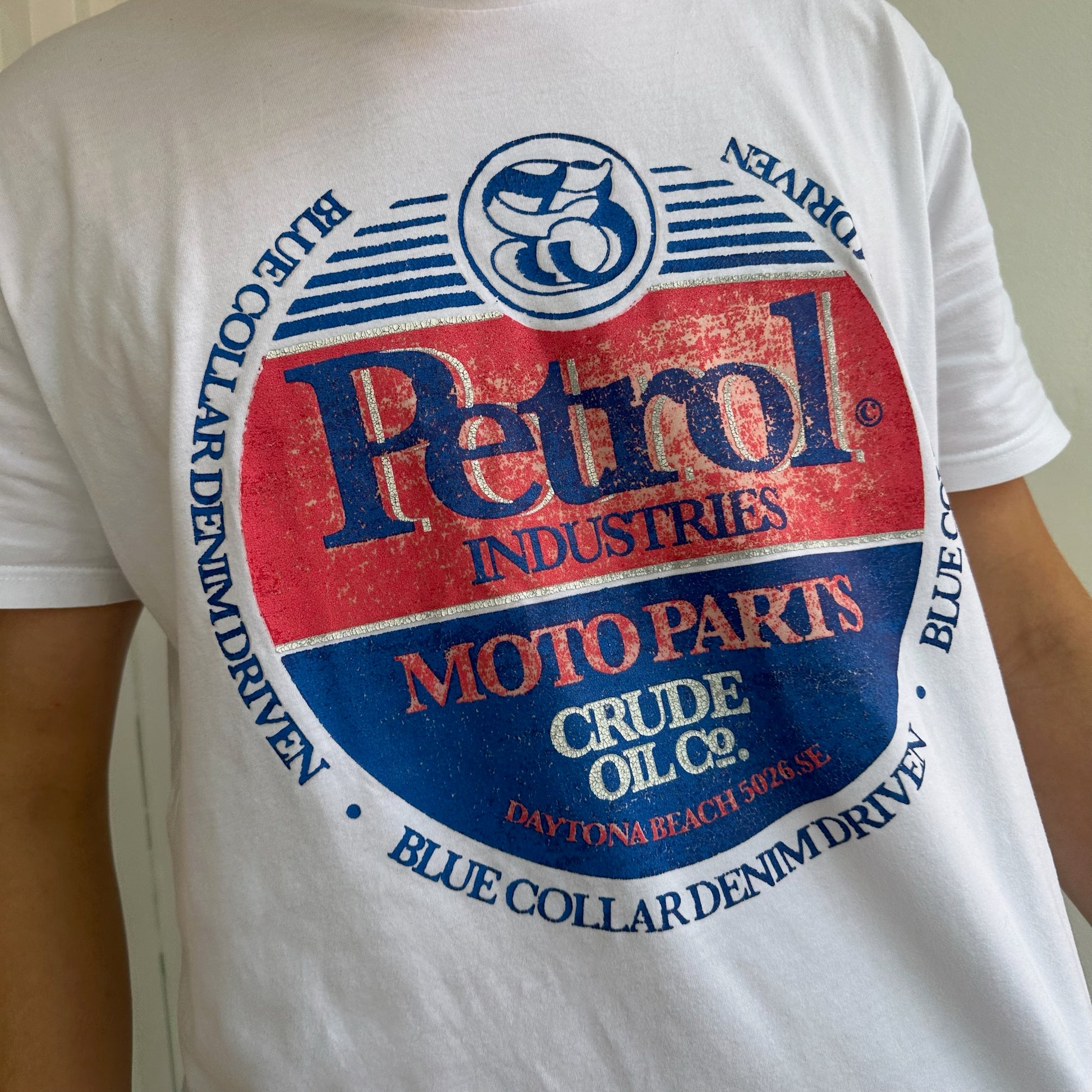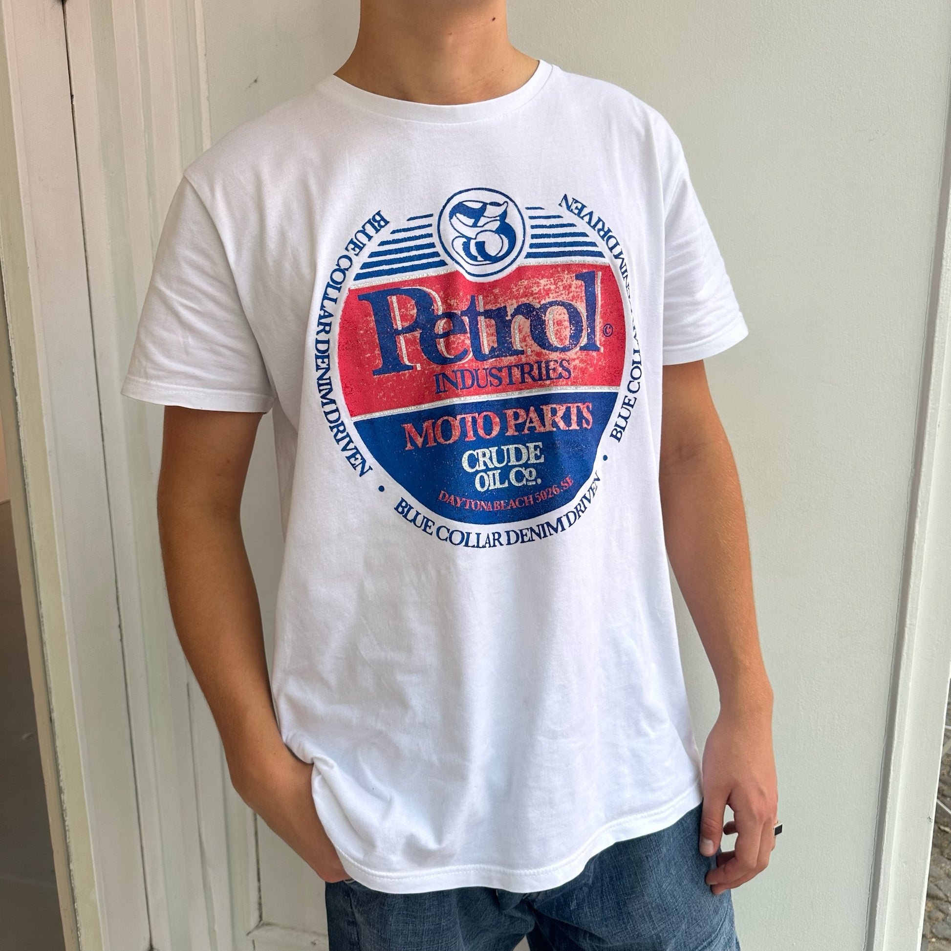 Leo is wearing a white printed T-shirt. Men's size 2XL.