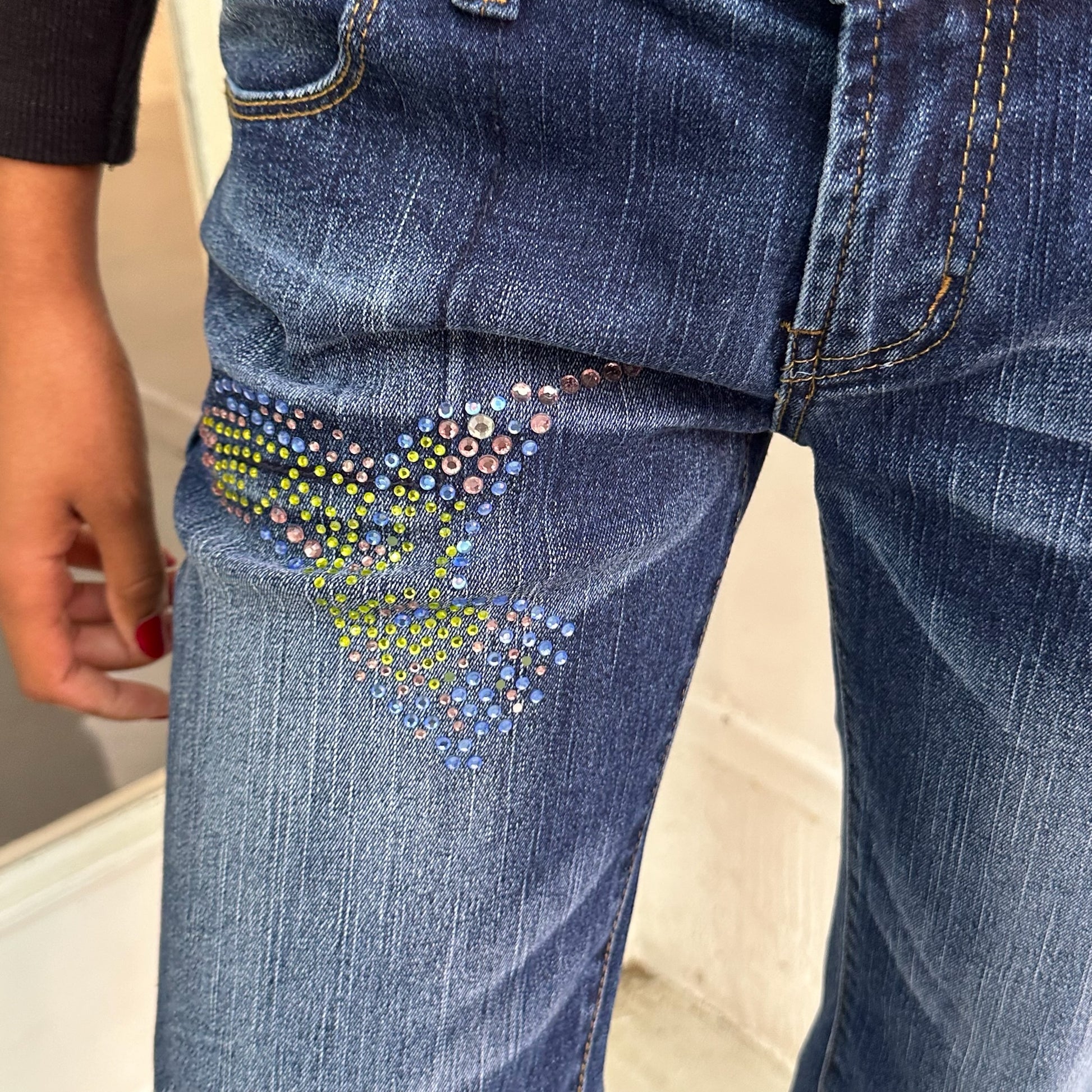 Jeans im Y2K Stil mit Strasssteinen auf der Vor- und Rückseite. Größe- Breite: 30 , Länge : 34.