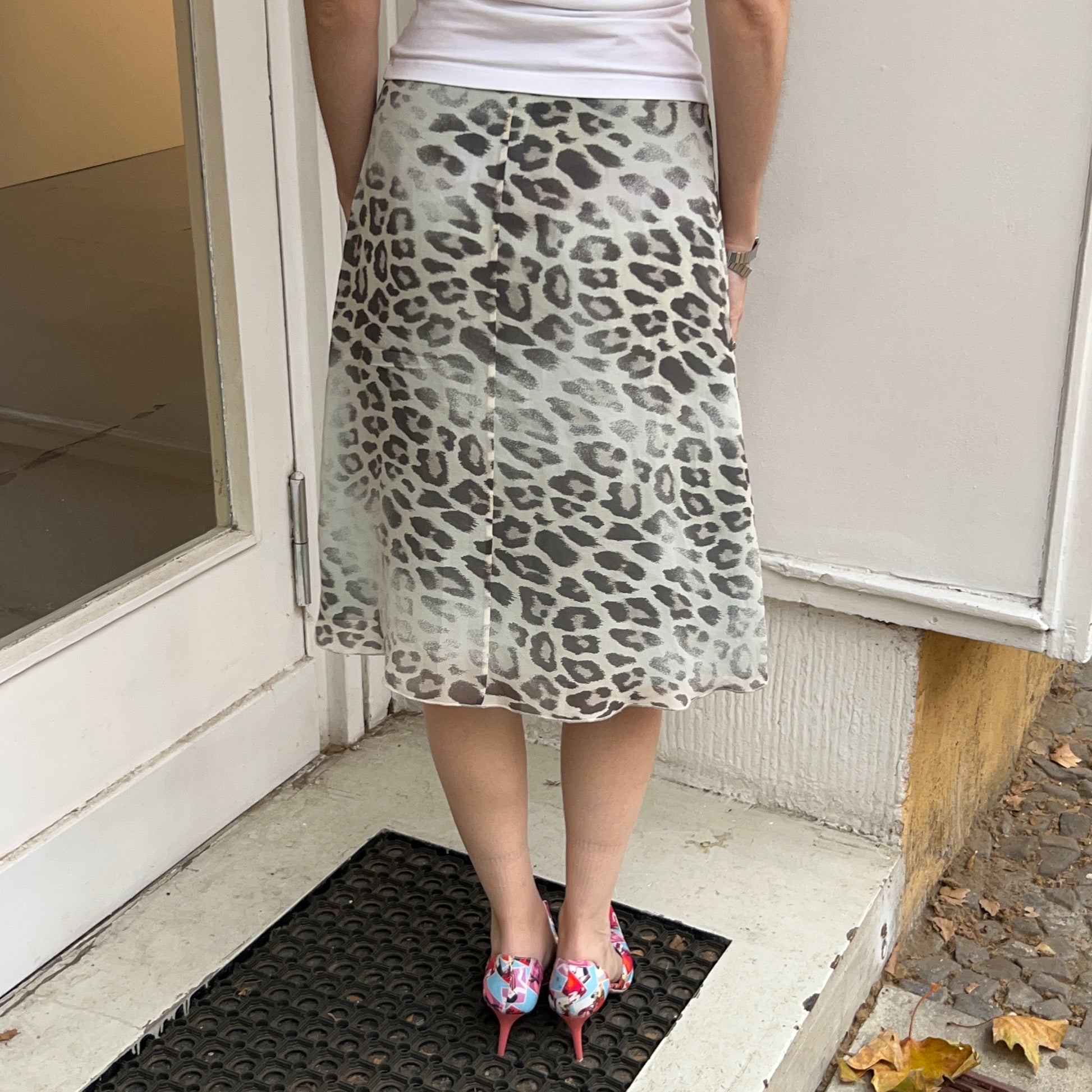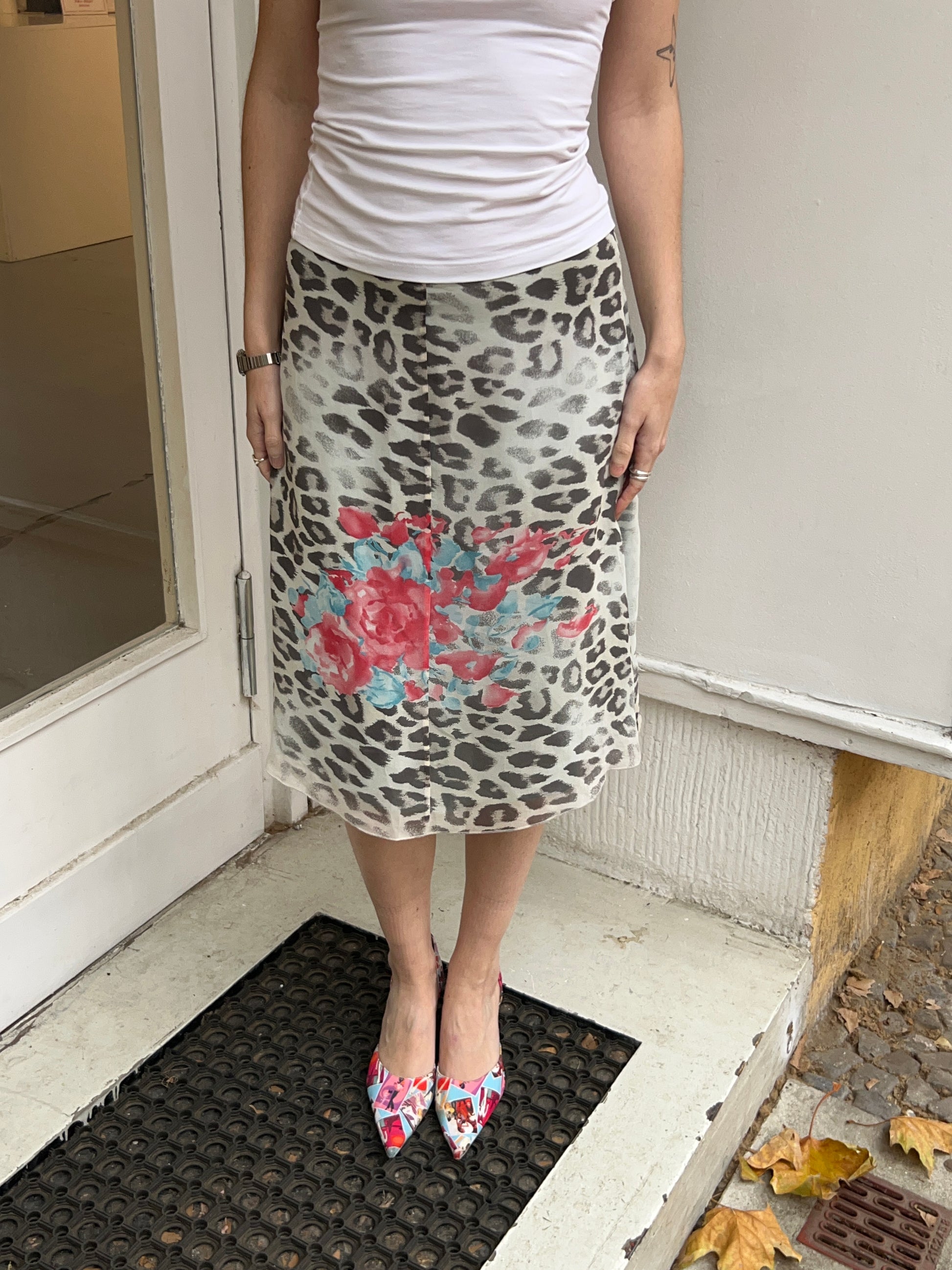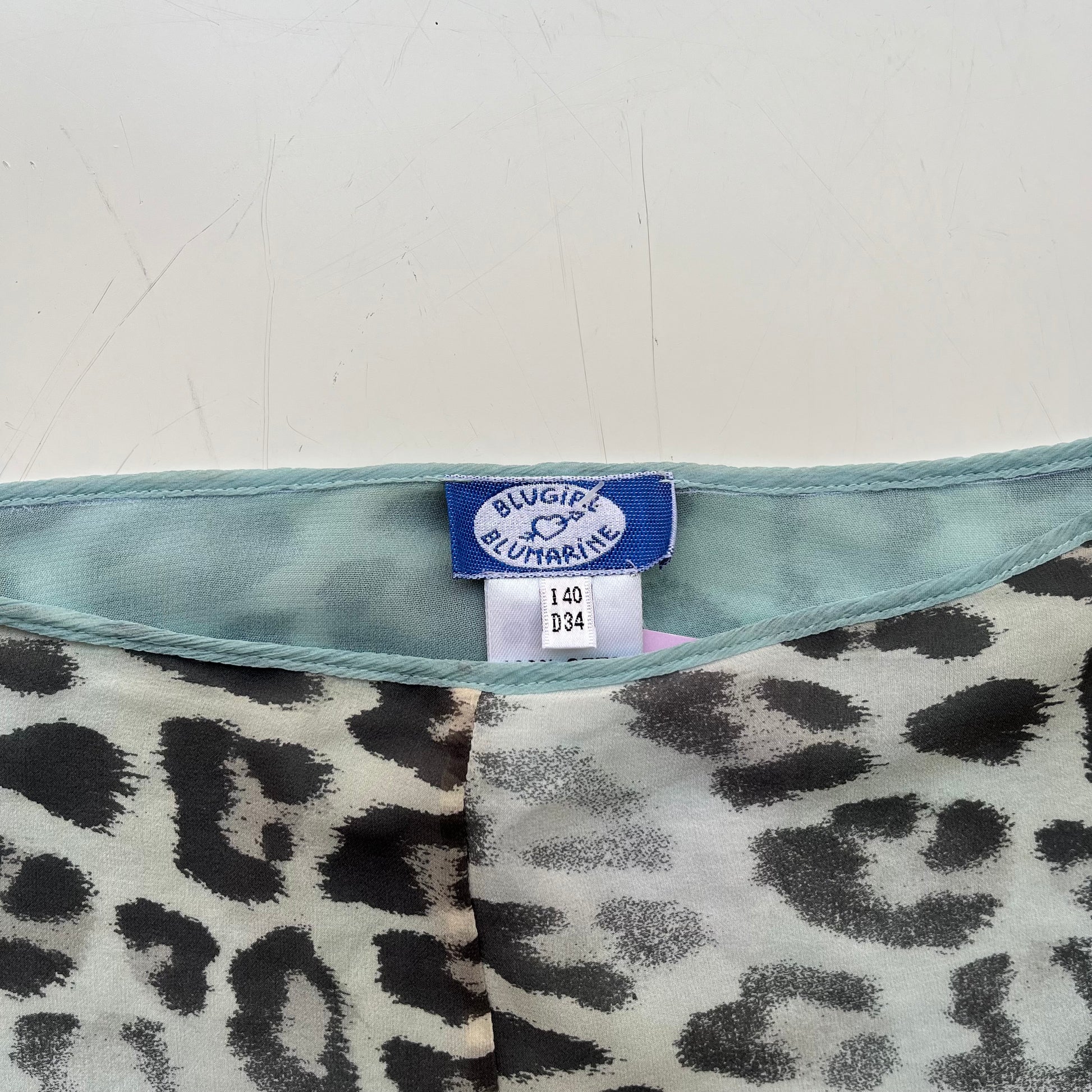 Blaue Seidenrock mit Cheetah-Print und floralen Details von Blumarine (Blugirl). Größe S.