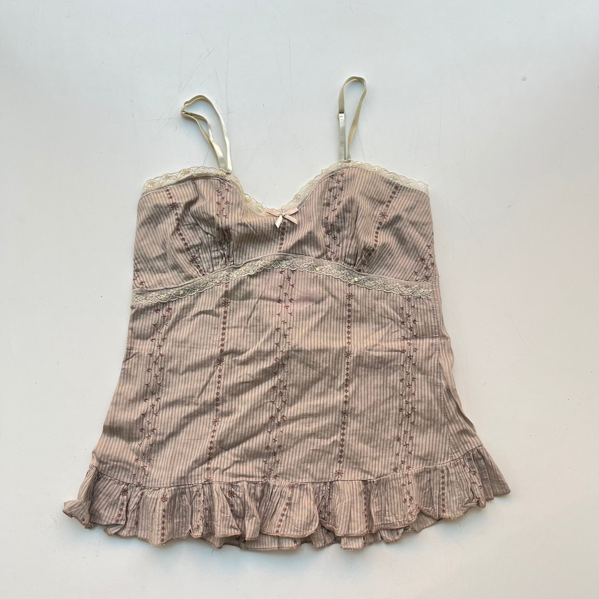 Brown cami with ribbon, lace and embroidered details. Small sequins in the lace. Adjustable straps. Size M.
