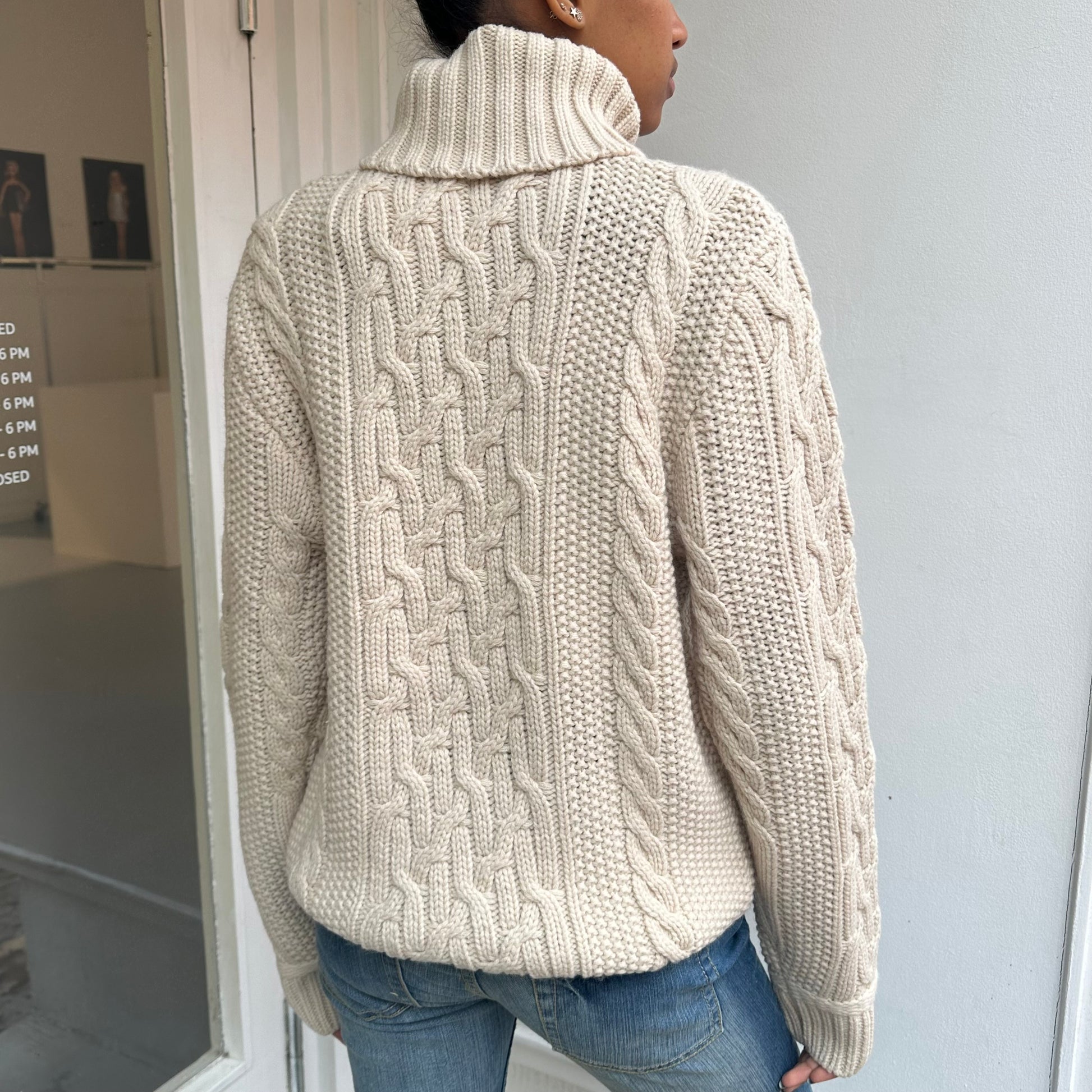 Thick cream-coloured wool turtleneck sweater. Size M but would fit a Size XS as an oversized, chunky sweater.