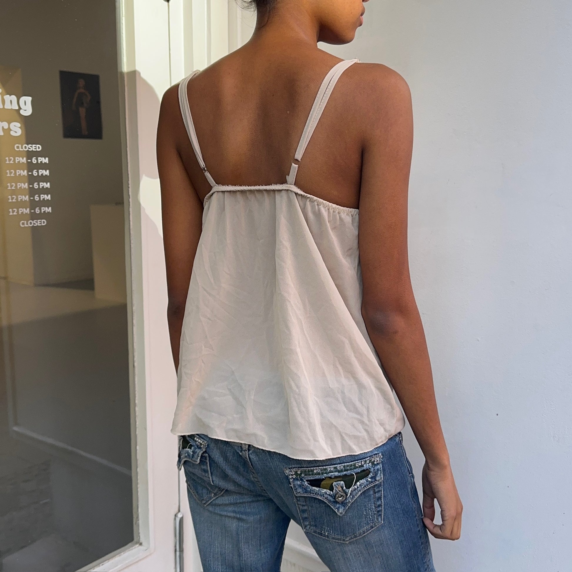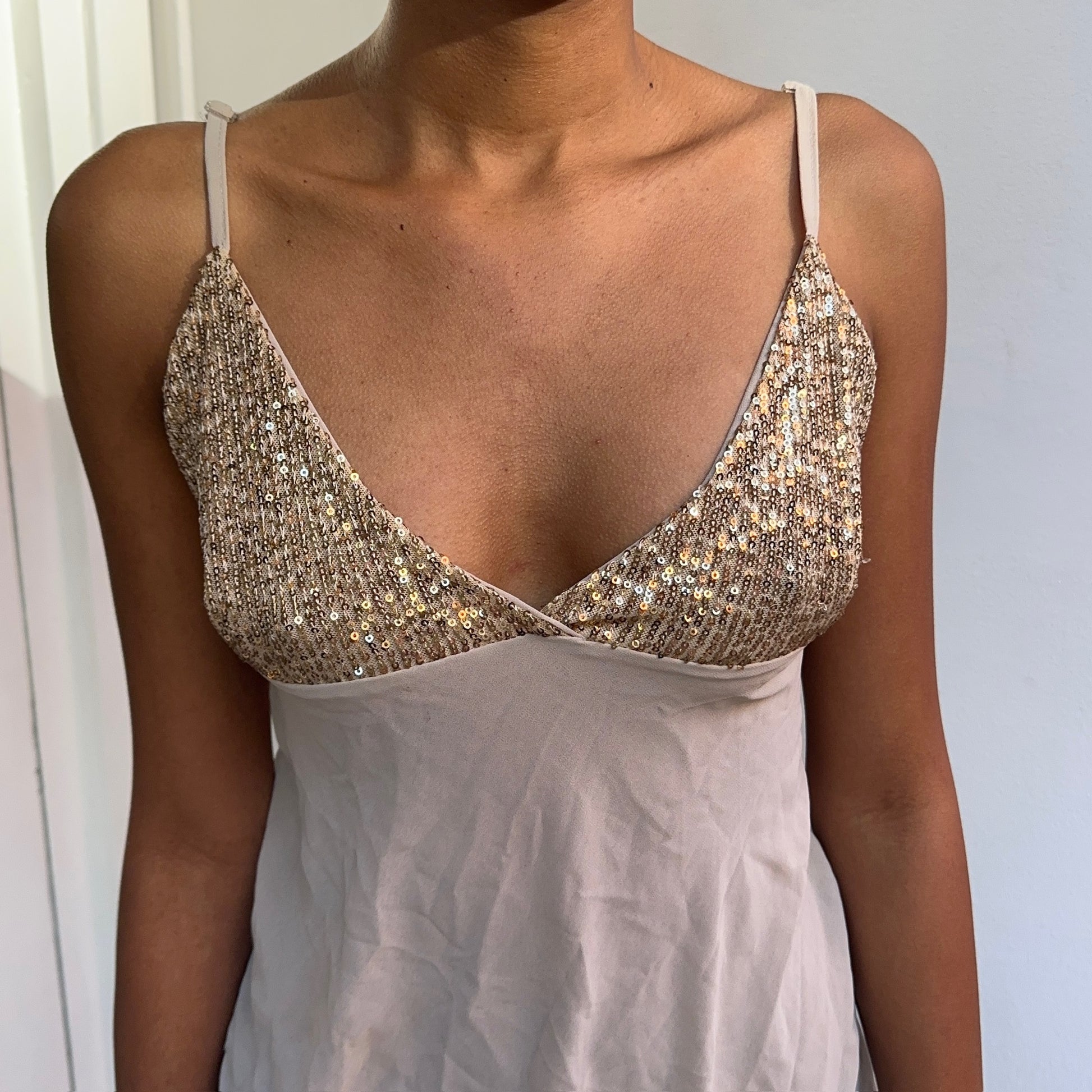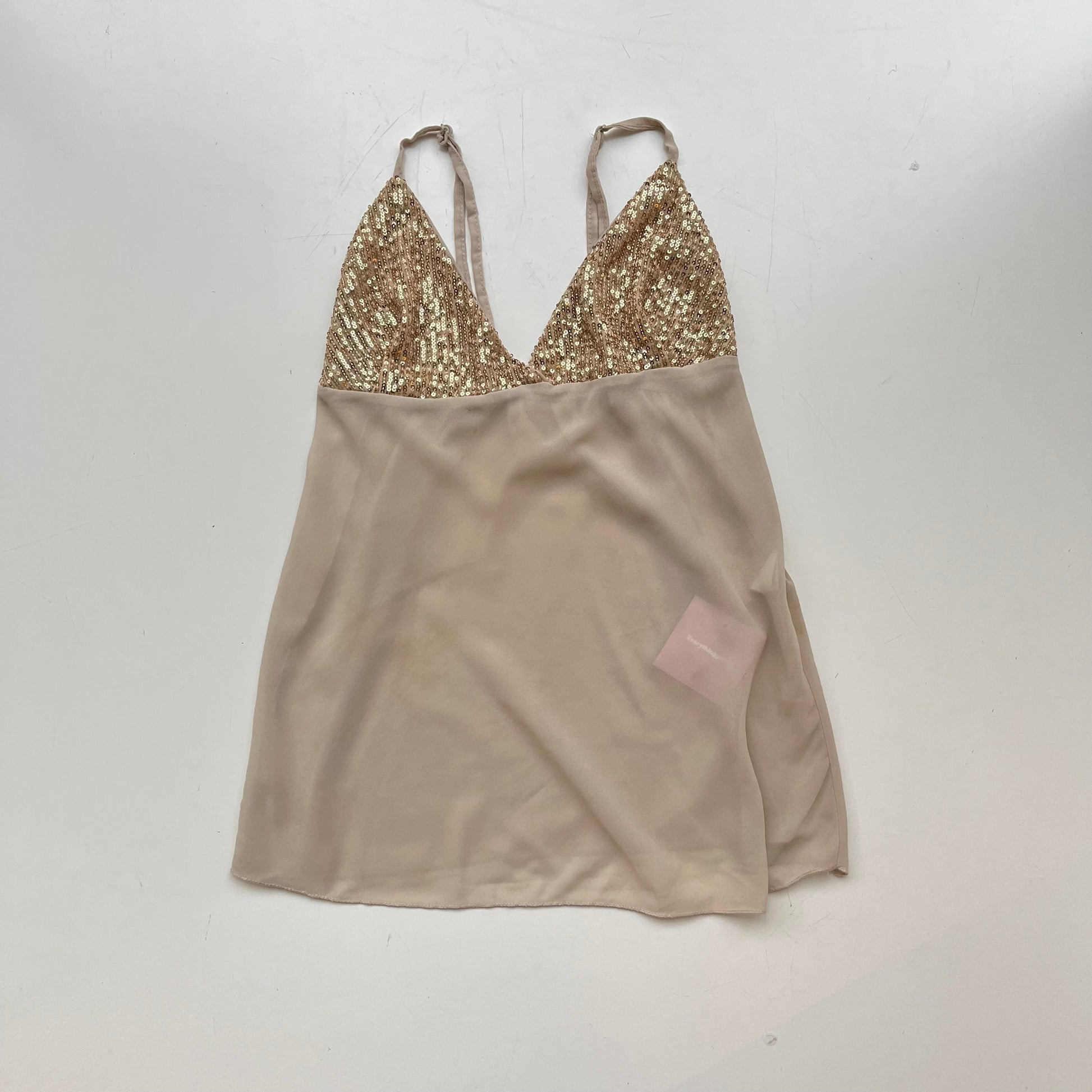 Beige cami with gold sequined breast cups and sheer fabric. Elastic hem and adjustable straps. Size XS-S