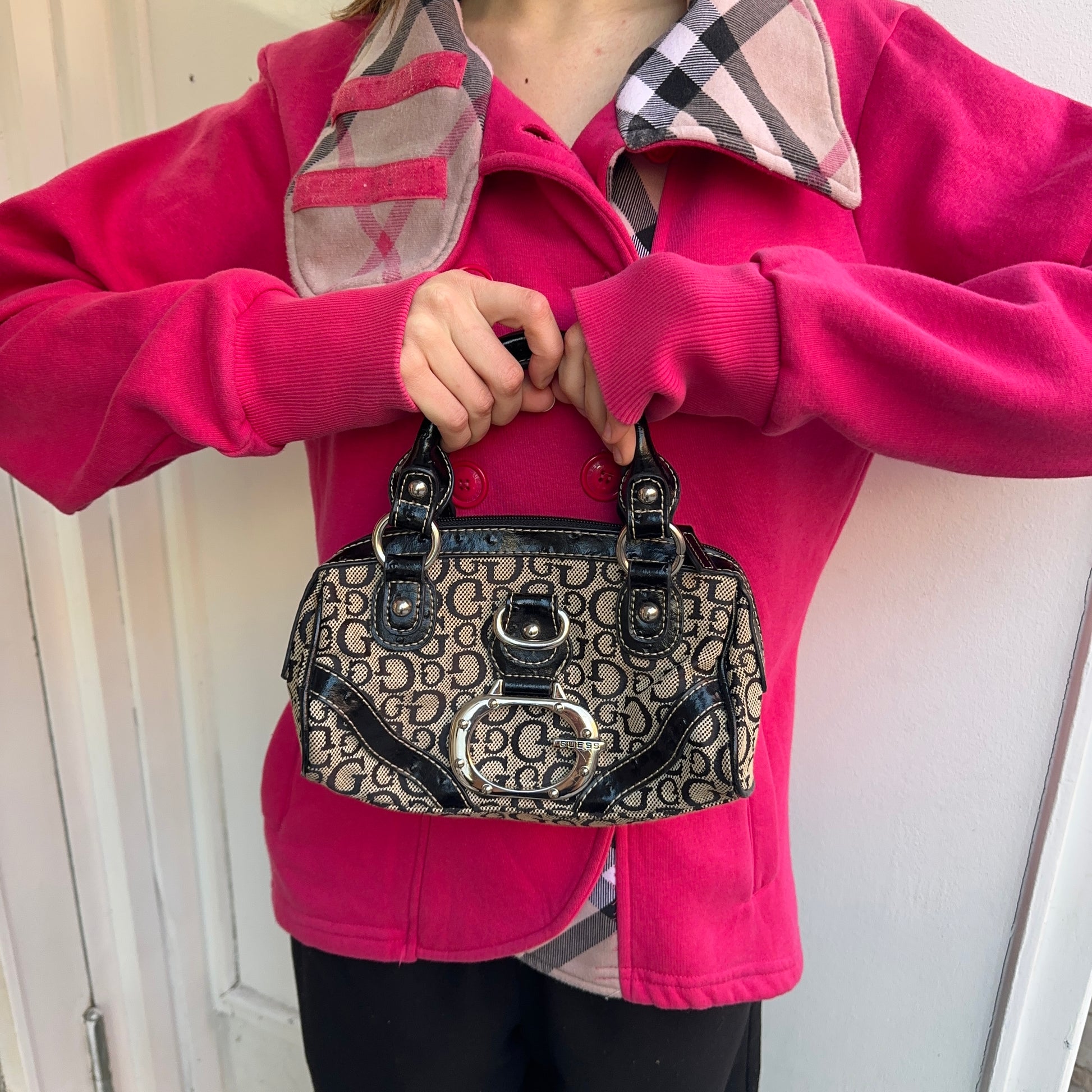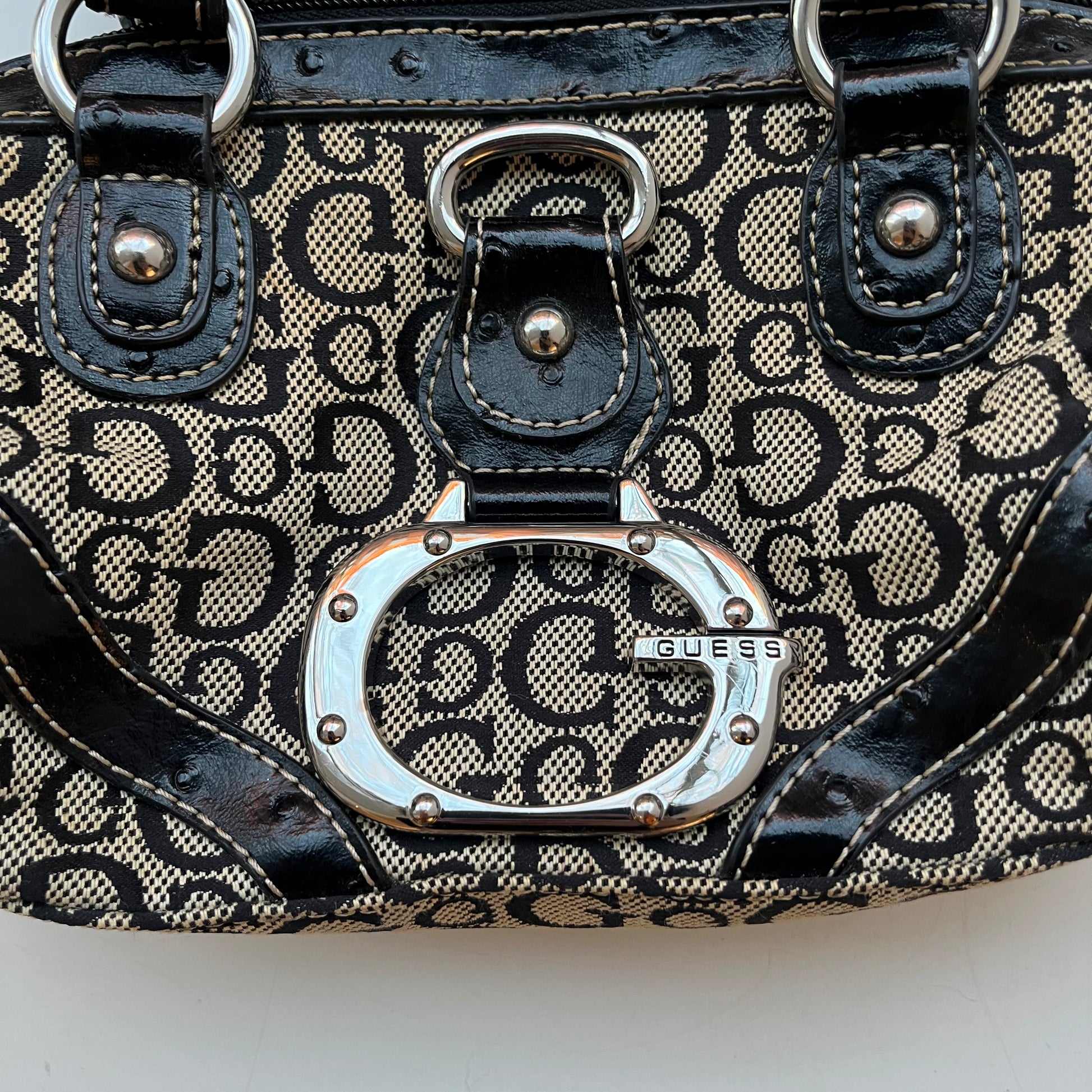 Mini black and beige GUESS handbag with silver detailing. Slight discolouration inside (see photos). Otherwise in excellent condition.