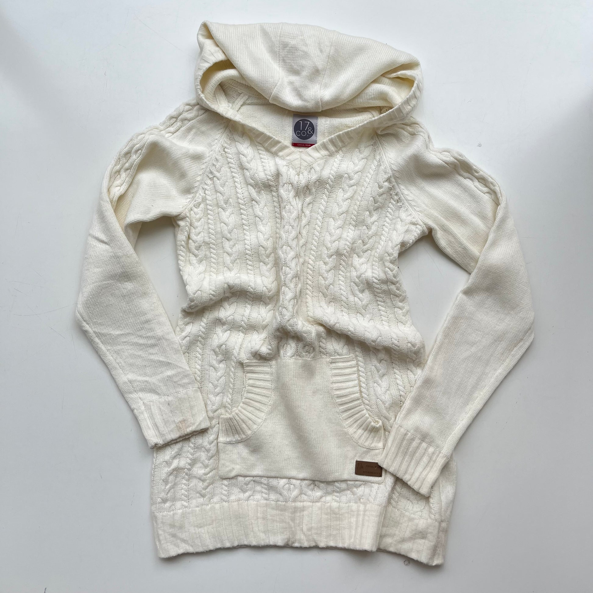White cable-knit hooded sweater. Size M.