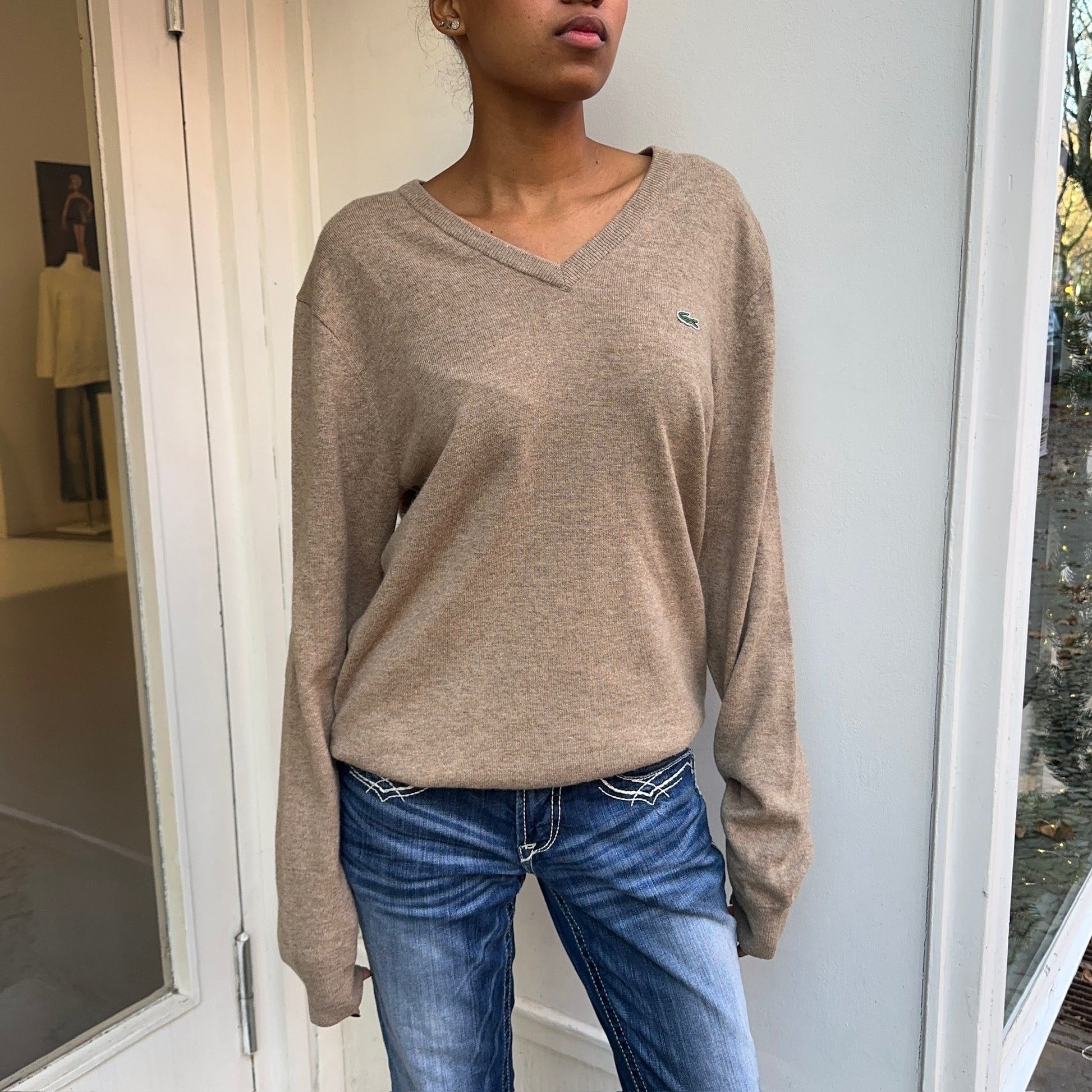 Beige 100% Wool Lacoste V-Neck Sweater. Size XL but would fit a Size M as an oversized look.