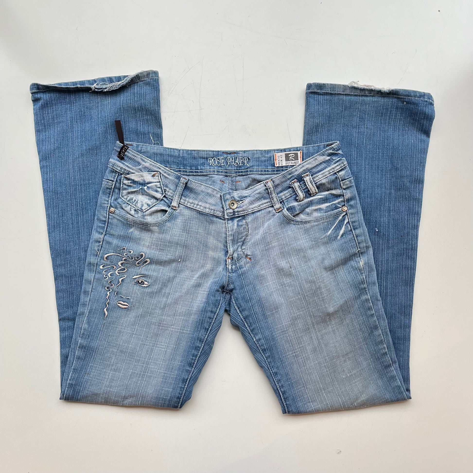 Low Rise faded blue jeans with white embroidered details. Waist measurement: W33/84cm. Length: 84cm. Jeans shows slight signs of use, see photos.