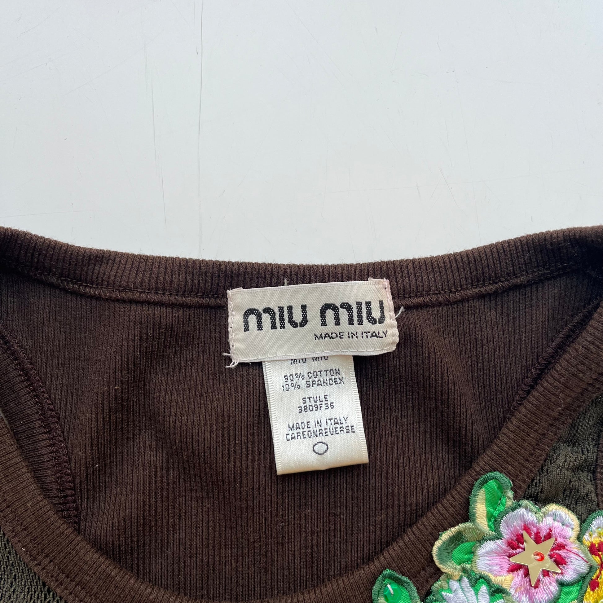 Braunes transparentes Oberteil mit Blumenstickerei. Marke: Miu Miu. Hervorragender Zustand.