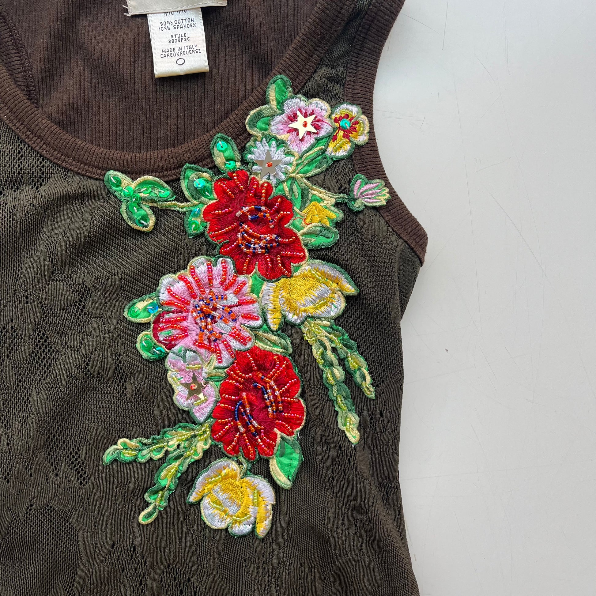 Brown sheer top with floral embroidery. Brand: Miu Miu. Excellent Condition.