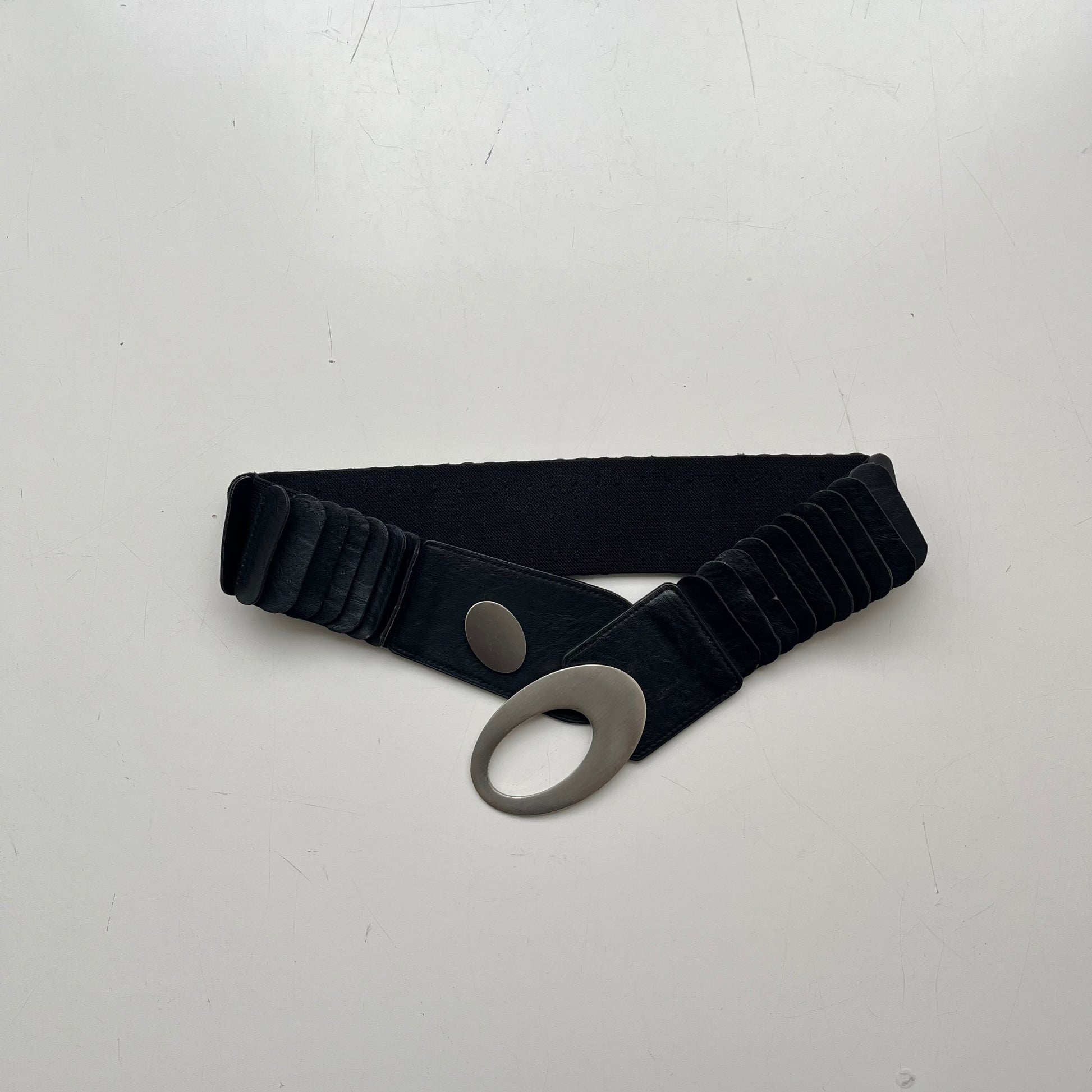 Schwarzer elastischer Gürtel mit silberner ovaler Schnalle.
