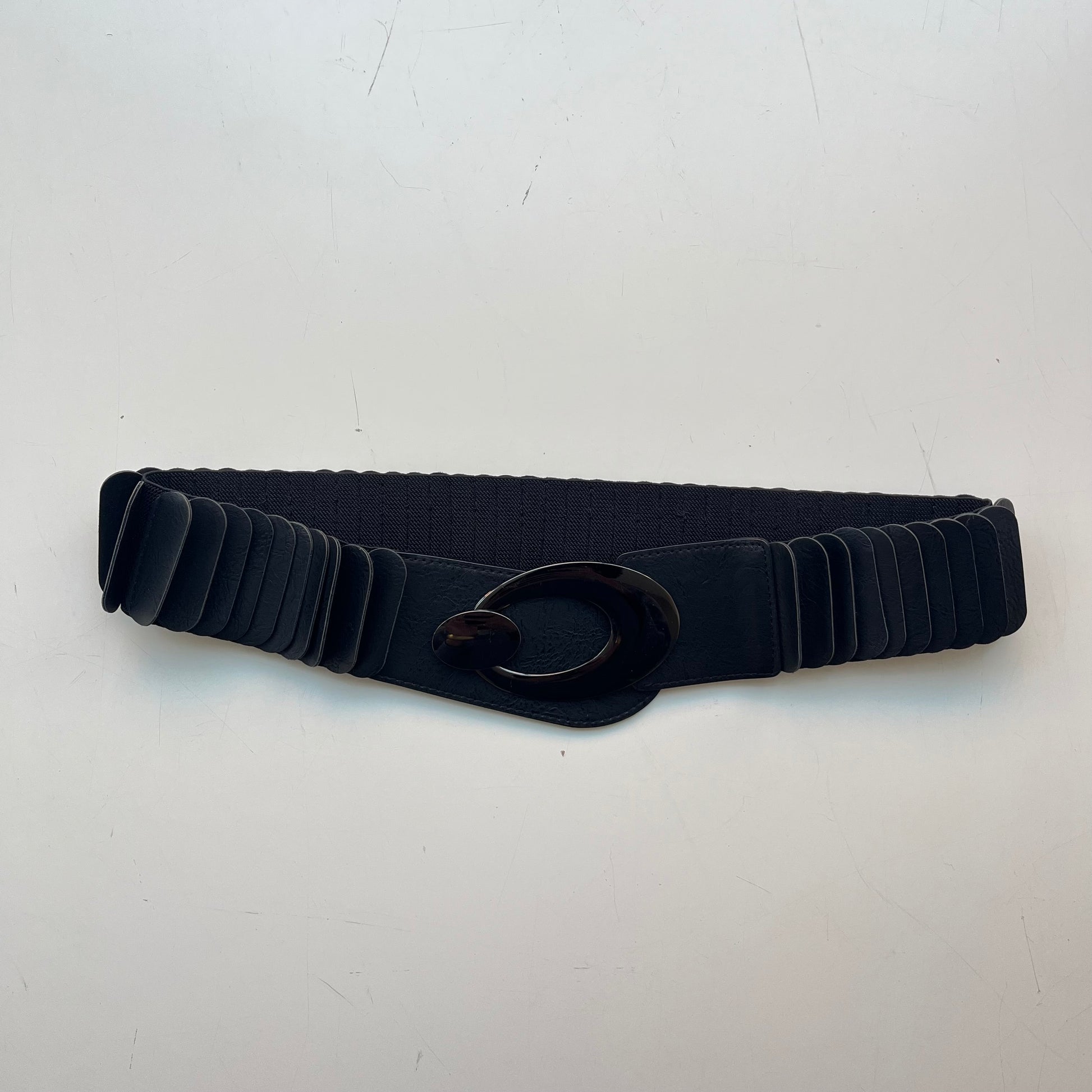 Schwarzer elastischer Gürtel mit schwarzer ovaler Schnalle.