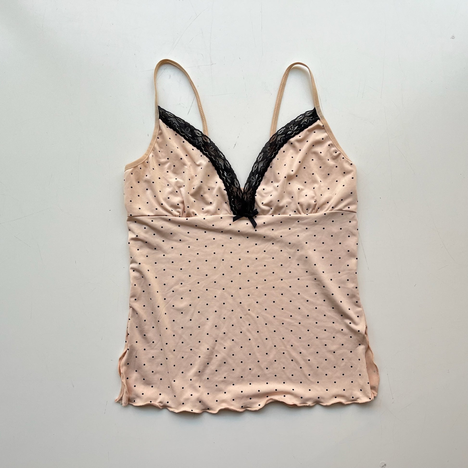 Pinkes Cami-Top mit Polka-Dots, Spitzenbesatz und schwarzer Schleife auf der Brust. Größe S/M.