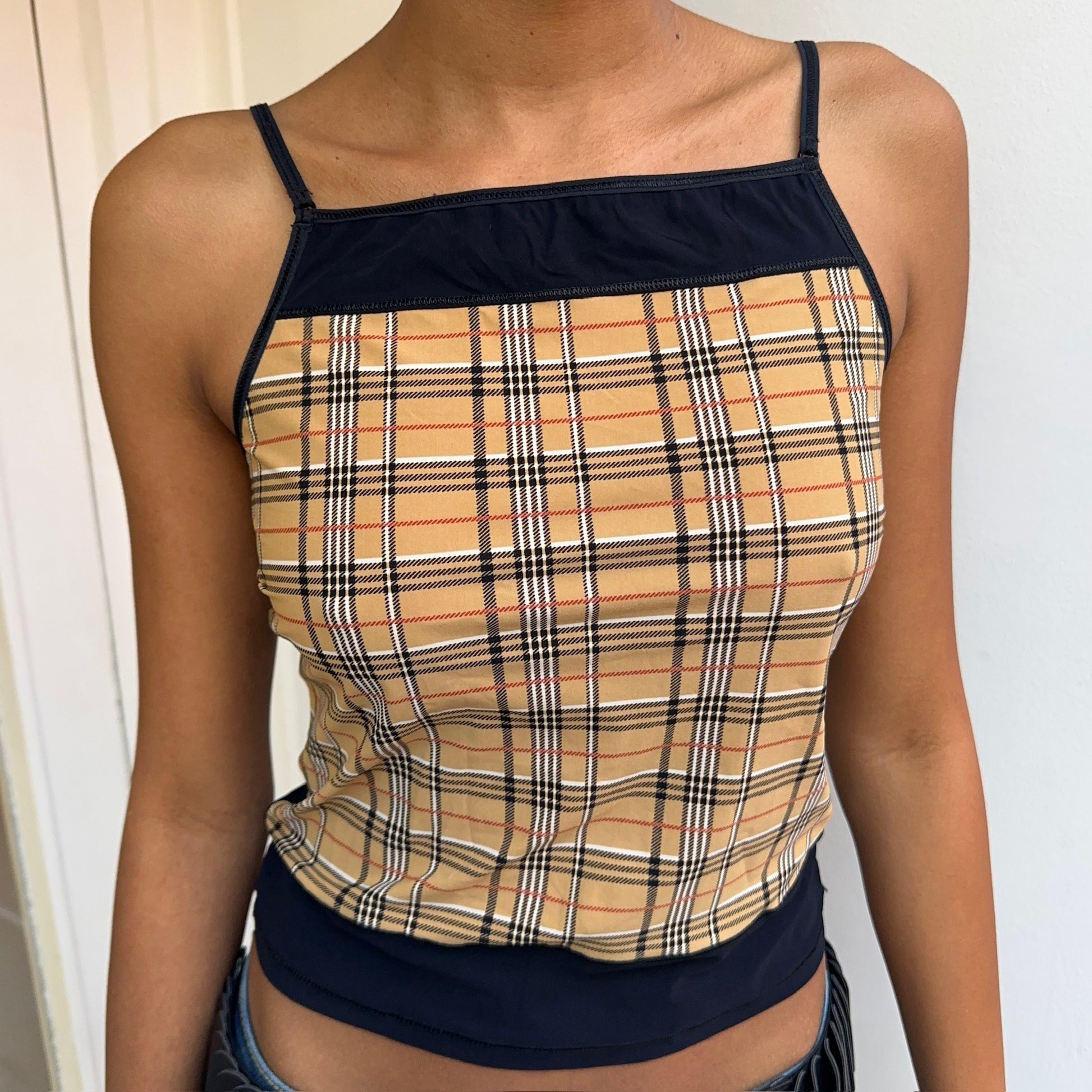 Schwarzes Cami-Top mit beigefarbenem Tartan-Muster. Größe XS–S.
